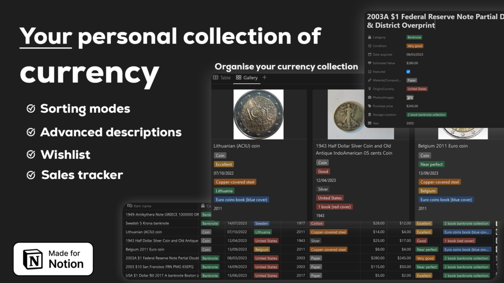 Get started today and take control of your currency collection journey. With our Notion template, your collection will be organized, beautiful, and fully adaptable to your needs.