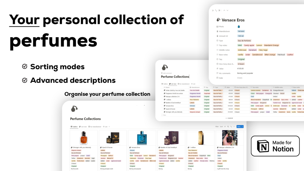 Transform your perfume collection into a digital masterpiece. Get our custom Notion template now and embark on a scented adventure!